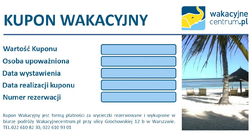 Proponujemy Państwu zakup Kuponu Wakacyjnego o dowolnej wartości na prezent świąteczny dla bliskiej osoby, do wykorzystania w ciągu roku w biurze.